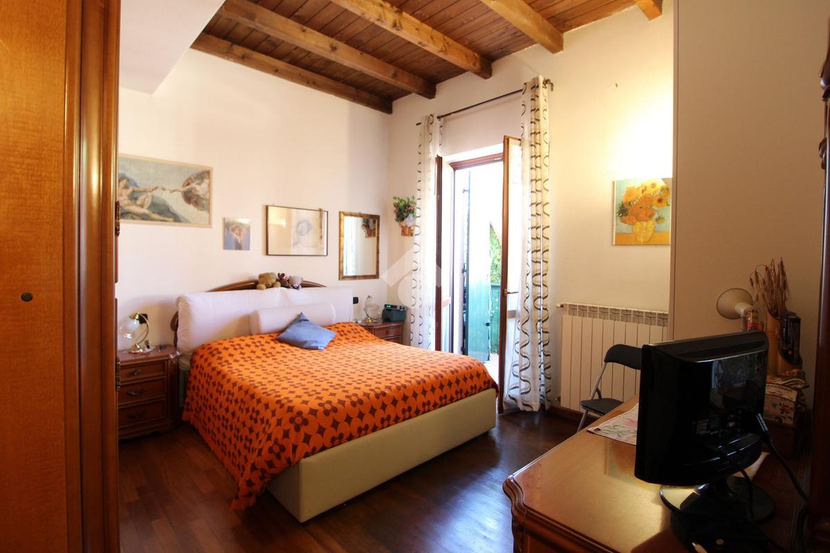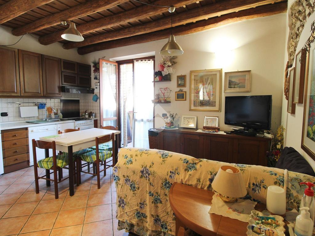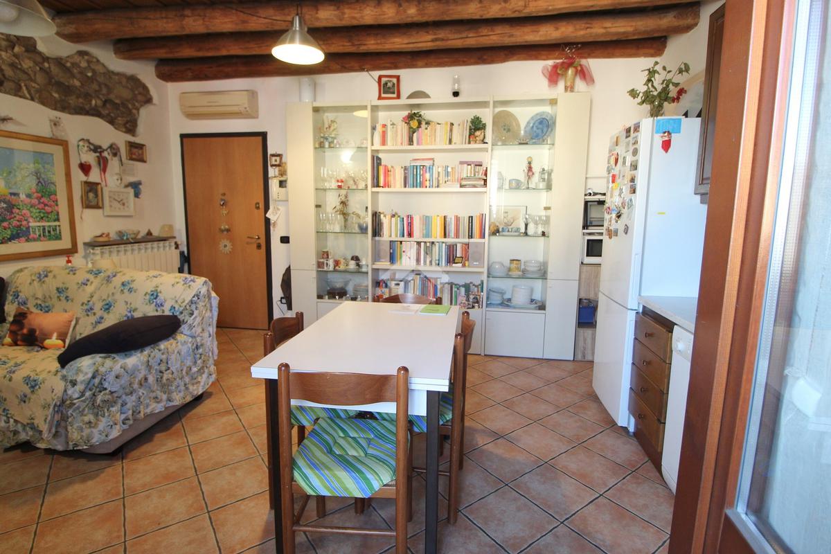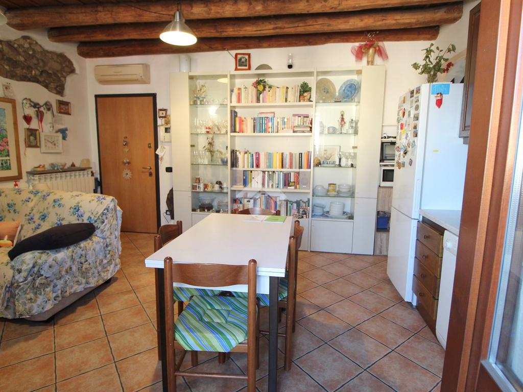 Quali accessori e finiture la soluzione presenta: portoncino blindato, videocitofono, pavimenti in ceramica, parquet nella camera da letto, travi in legno a vista, serramenti in legno con vetrocamera, scuri in legno, porte in tinta tanganika e decorazioni murali con ciottoli a vista, impianto di climatizzazione dotato di due split (uno a servizio della zona giorno, l’altro della camera da letto).