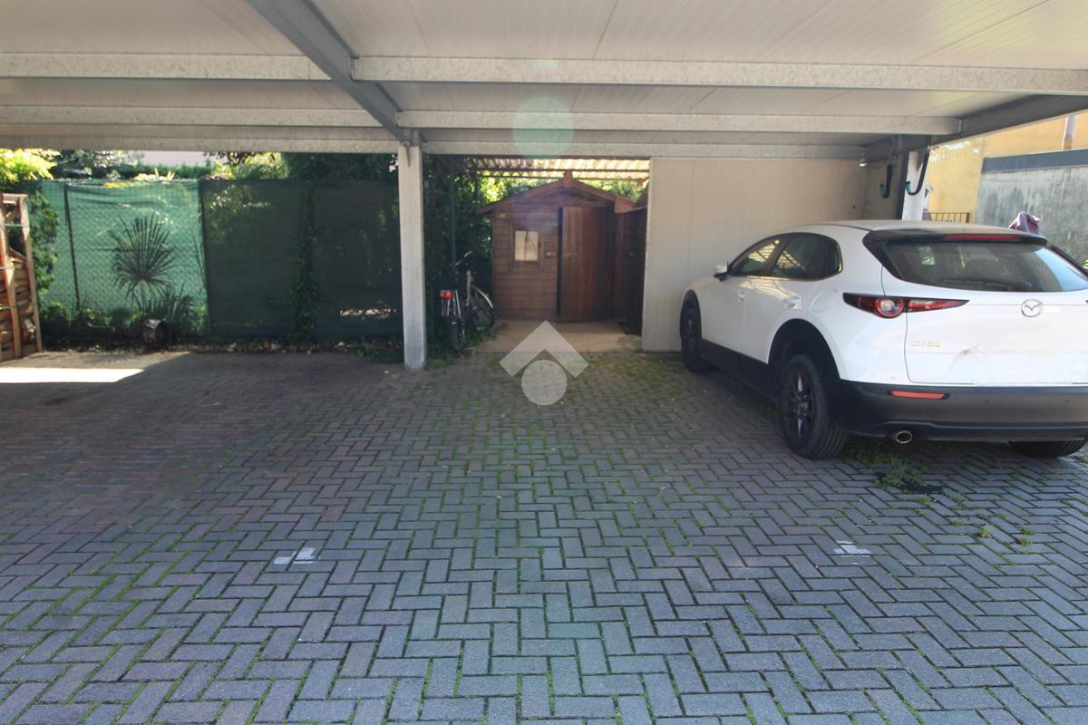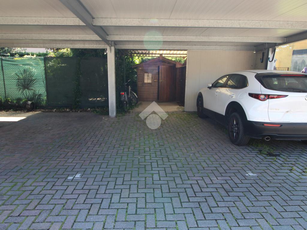 A completamento della proprietà, nella corte posta sul retro dello stabile, vi sono 2 posti auto esterni (uno scoperto e l’altro coperto) e un’area di pertinenza esclusiva, ove è presente un piccolo prefabbricato in legno utilizzato come deposito/ricovero attrezzi.
